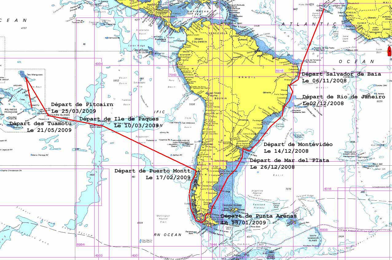 P 217 et 218 Partir assez bien vers l'ouest car la zone de calmes équatoriauxse rétrécit (néanmoins pas plus que 30 ° W). Pas de probl de cyclones. Fortaleza, plus au nord, peut être un bon port d'entrée. Arrêt à l'île Fernando de Noronha (normalement interdit sauf urgence) |