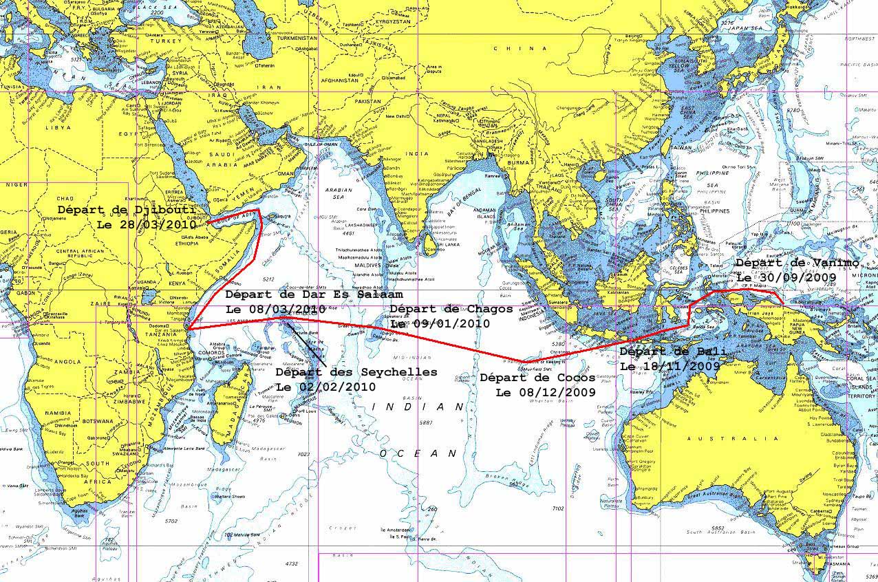 Voir question en J 46.Il peut être prudent de passer les Coco's et tirer direct sur les Chagos pour rester plus nord (Nb 2000M!) |