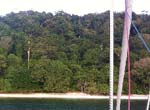 Le lendemain, nous repartons à l’aube. Au passage un petit café sur le bateau tout neuf de Dave, qui a des renseignements à donner sur l’arrivée à Phuket. Route au moteur vers une petite île dont j‘ai oublié le nom. La traversée est agréable, au milieu des flottilles de pêche. Notre ligne de traine ne ferre aucun poisson, ce n’est pas étonnant, vu la densité des bateaux et le chalutage intensif. A l’arrivée au mouillage, un bruitage intense domine le bruit de la mer: ce sont des stridulations d’insectes. Sur la plage de sable blanc, devant la colline de jungle, nous découvrons des traces de varans. Nous ne verrons pas les varans, mais nous allons débarquer pour la pose T punch du soir. Le rêve de barbecue ne peut pas se réaliser, car nous sommes maintenant en Thaïlande dans un parc national. Faire un feu sur la plage serait une faute de goût et pas du goût des rangers chargés de la surveillance.