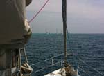 Quand je prends mon quart, le bateau a avalé beaucoup de miles, nous avons 1 heure d’avance sur les prévisions. La consigne est donc de virer à 180°, de faire route ½ heure, puis de virer à nouveau à 180° et le tour est joué. Avec le pilote automatique, c’est simple : on appuie sur la touche 90° deux fois, le bateau vire tout seul à 180°, il n’y a qu’à suivre pour le réglage des voiles et ½ heure plus tard on recommence la manœuvre en sens inverse. Ainsi, nous arrivons pile au point prévu, à l’heure prévue. Il est 7 heures, il est temps que je réveille Hugues. Le vent a forci, nous réduisons un peu la voilure et finissons l’approche pour aller mouiller à Shalong bay. Nous sommes sur l’île de Phuket, mais nous devons nous arrêter à Shalong bay pour faire les formalités d’arrivée en Thaïlande.