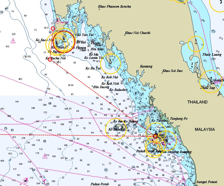 Ce riche temps de rencontre avec nos navigateurs touche maintenant à sa fin (ainsi que ce long récit de voyage). Après une dernier snorkling à l’île semillane N°2, nous nous lançons dans une belle traversée d’un peu plus de 100 miles que nous allons faire sur les 24 heures qui restent. Calme plat jusqu’au soir, où un grain orageux va laisser place à un vent fort en navigation au près pour toute la nuit Dans ce cas là, on dort plus contre les cloisons que sur le matelas, dans les embardées du bateau qui pourtant, coupe bien les vagues sans taper. Nous nous amarrons dans la Yacht haven Marina, où Ratafia restera seul une semaine, pendant que les navigateurs font du tourisme terrestre ou marin en Thaïlande. Pour moi je fais ma valise tout rempli des impressions engrangées pendant ce séjour. Cyril me raccompagne à l’aéroport où nous avons encore plein de choses à nous dire et d’émotions à partager