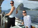Au début, ça allait, quand on était dans la baie de RIO on rigolait bien avec Guillaume, on était les capitaines du bateau on se prenait en photo à la barre, on buvait des cafés (au passage, évitez les cafés de Cyril avant de prendre la mer ; ça vous réveille un mort, mais ça vous tue le ventre ; surtout avec leur petite cafetière italienne, mon dieu, j’ai jamais bu des cafés aussi costauds!). C’était vraiment sympa, y’avait des vagues qui nous poussaient et faisaient surfer le bateau et Guillaume et moi nous faisions «ooOOh ça bouge ! »Et c’était drôle.