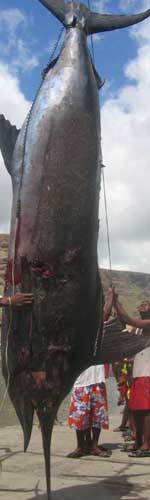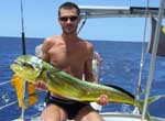 Aujourd'hui est un grand jour : on remonte enfin notre premier poisson, et jusqu’au pont du bateau cette fois ci! C’est une grosse dorade Coryphène et le bateau se transforme vite en boucherie. |