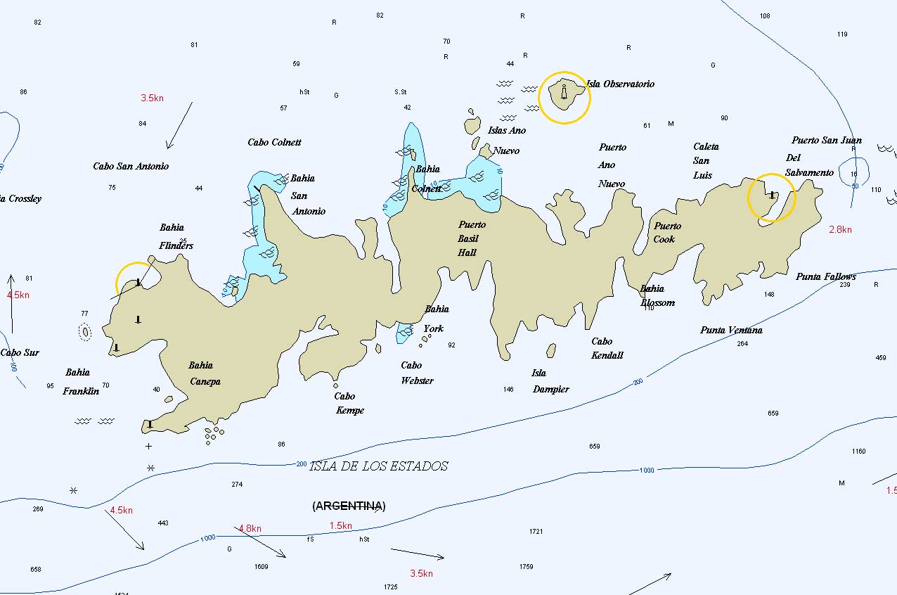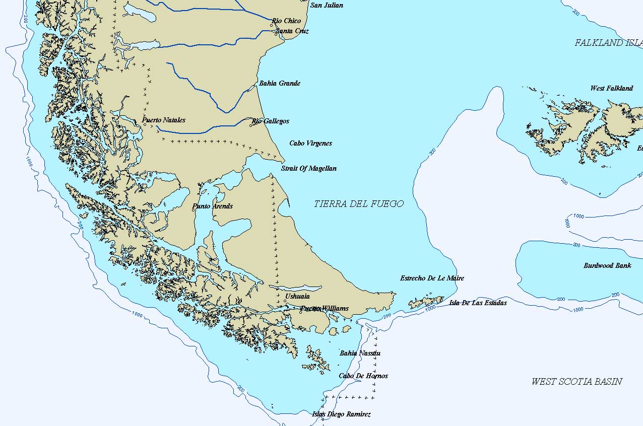On vient de passer trois jours de préparation intense du bateau, RATAFIA est a présent au poil pour le départ: haubans retendus, spi et génois révisés, petit génois et étai larguable à poste avec trinquette et tourmentin prêts à l'emploi, pilote de secours réparé, moteur vidangé. On pense s'arrêter après 500 miles à la Caleta de Horno ou à la Caleta Sara pour 3 jours, puis continuer 600 miles de plus et s'abriter a l'Île des Etats (qui a l'air magnifique) à la pointe SE du continent Sud Americain et y attendre les courants favorables pour entrer dans le canal de Beagle. (Voir les cartes ci-contres)