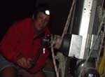 A Caleta Horno, un filin malin s'est glissé à l'eau et sournoisement pris dans l'hélice. Le moteur tourne encore mais elle non. Le temps de jeter un oeil à la cale moteur, le vent nous pousse doucement vers les cailloux au bord de la calanque. Bon, on a vite jeté l'ancre et assuré le bateau avec 3 longues amarres supplémentaires, avant de retourner voir le moteur: aïe, c'est tout cassé là dedans...