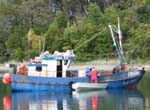 Pour la deuxième fois on est bloqué par le mauvais temps à Caleta Atracadero. Cette nuit des giboulées ont recouvert tout de blanc, ça a bien soufflé mais ce matin il fait bon et on s’apprête à partir quand les pêcheurs qui sont à couple nous informent que ce n’est pas une bonne idée : eux-mêmes ne sortiront pas cause avis de coup de vent. Mais disent ils, c’est l’occasion de se connaître mieux en partageant à leur bord le Maté, tisane locale nullement euphorisante et pourtant légèrement addictive ; ainsi que très conviviale car on se la passe de bouche en bouche en discutant. Ce soir ils vont cuisiner pour nous faire goûter une centolla : le roi des crabes locaux. |