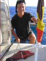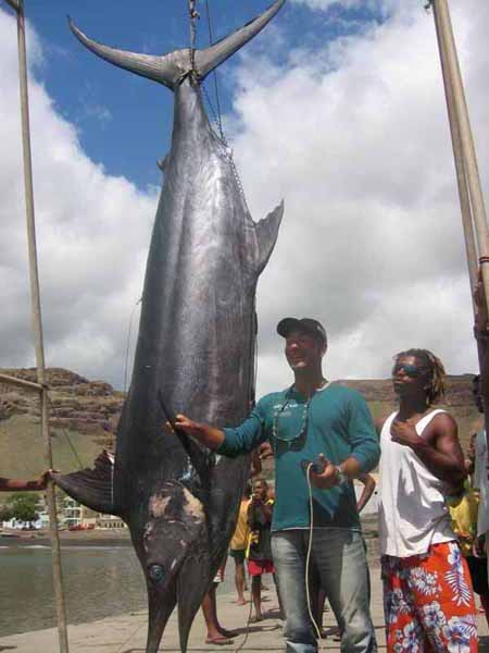 Nous avons ensuite mis les voiles pour l’île de Sao Nicolau où on s’est arrêté dans le petit port sympathique de Tarrafal. Un bateau de pêche au gros a ramené un espadon de 400 kilos (je n’ai jamais vu un poisson aussi gros, voyez la photo), Même mort, le bestiau avait l’air plus intelligent que l’américain qui se pâmait devant lui, l’air satisfait et suffisant.
