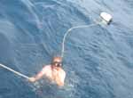 Cette traversée a aussi été l’occasion de se baigner pour la première fois en haute mer, à 200 nautiques (+/-400 km) des côtes les plus proches. On a beau se dire que ça n’arrive jamais, on pense quand même aux sales bêtes quand on se laisse descendre dans l’eau, avec 4000 mètres de fond sous la quille du bateau. On fait une belle ligne de pêche accrochée à notre amarre terminée par un pare battage. Les bains ne s’éternisent pas, et même si on a du mal a se l’avouer, on est toujours un peu soulagé lorsque on remonte à bord.